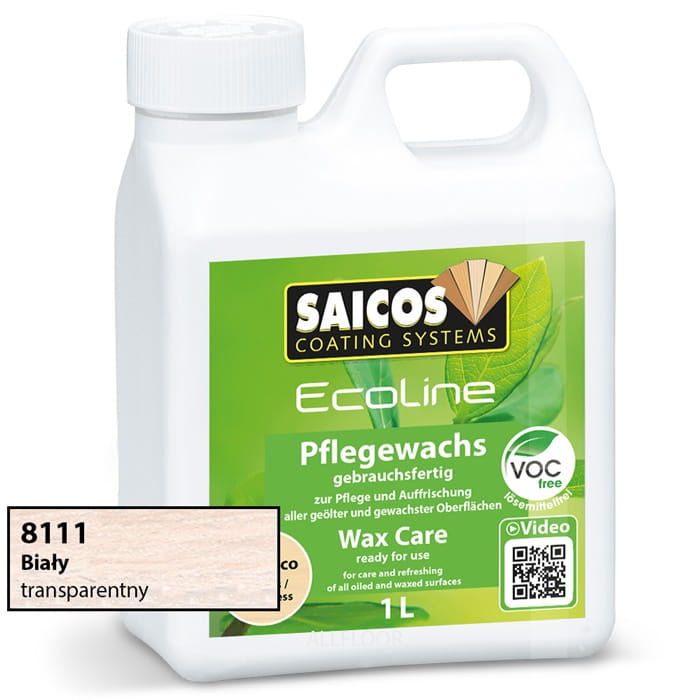 Występuję w dwóch kolorach (kolor biały jest przeznaczony tylko do podłóg bielonych, do innych kolorów zalecamy stosowanie preparatu o bezbarwnym kolorze, który dostępny jest jeszcze w sprayu jako Saicos Ecoline Wax Care Spray):